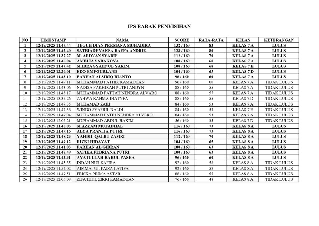 Berdasarkan hasil babak penyisihan SSC, dengan ini kami sampaikan bahwa dari tiga bidang lomba, yaitu Matematika, Ilmu Pengetahuan Alam (IPA), dan Ilmu Pengetahuan Sosial (IPS), telah ditetapkan peserta yang lulus ke babak berikutnya dengan ketentuan sebagai berikut: