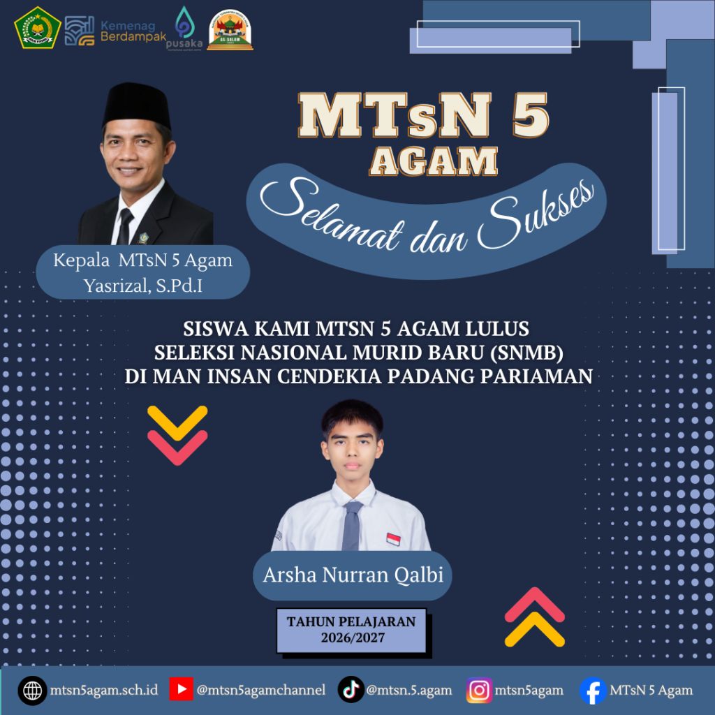 Tiku, Humas – MTsN 5 Agam kembali menorehkan prestasi membanggakan. Salah satu peserta didik kelas IX, Arsha Nurran Qalbi, berhasil lulus Seleksi Nasional Murid Baru (SNMB) Madrasah Unggulan Tahun Pelajaran 2026/2027 dan diterima di MAN Insan Cendekia Padang Pariaman melalui jalur tes.