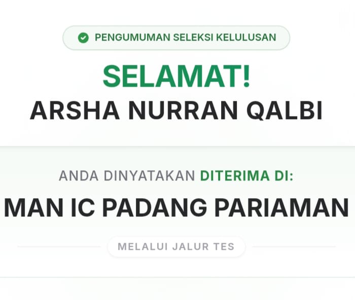 “Alhamdulillah, kami sangat bangga atas keberhasilan Arsha Nurran Qalbi yang telah lulus seleksi dan diterima di MAN Insan Cendekia Padang Pariaman. Semoga prestasi ini menjadi inspirasi bagi peserta didik lainnya untuk terus berprestasi dan meraih cita-cita terbaik,” ungkap beliau.